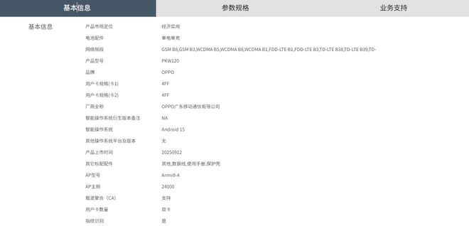 相关页面显示,OPPOA6i5G手机采用矩阵相机模组设计,屏幕尺寸为6.67英寸(电容式触摸屏),前置800万像素镜头、后置5000万像素+200万像素镜头,预装Android15系统。