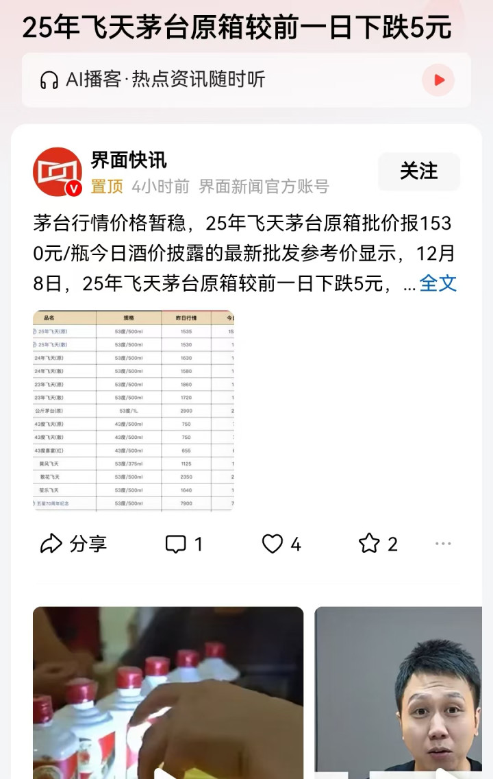 那么坚持白酒股长期投资的股民亏损严重,其中最知名的就是深圳的私募龙头但斌了,在被采访时含含糊糊的表示:尽管自己仍持有茅台,但投资重点已从传统消费转向AI科技赛道。那么股价表现很差,在消费领域的销售价格又是如何呢?其实随着2021年开始的消费内卷化,这些高档白酒的销售也开始出问题了,最新的一些情况发展也展现了未来的趋势。