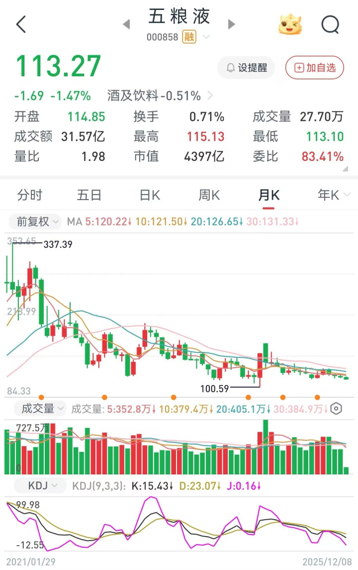 要说2024年的A股牛市这一轮,啥板块的股票最悲催?不得不要看白酒股了。其中座位领头羊的贵州茅台、五粮液股价也是一路走低,没有一点牛市风采。贵州茅台从2000多元跌破1499心理关口价,现在只有1418元,而五粮液更是惨不忍睹,4年间股价从最高点每股337元跌至113元炒股配资网站,市值蒸发了2/3。
