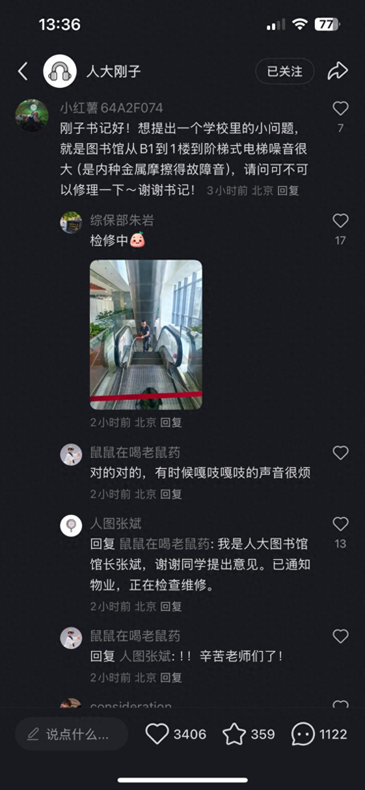 例如,有网友9月8日上午留言:“刚子书记好!想提出一个学校里的小问题就是图书馆从B1到1楼到阶梯式电梯噪音很大(是内种金属摩擦得故障音),请问可不可以修理一下~谢谢书记! ”