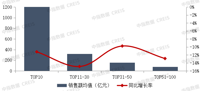 2025年1-9月,各阵营房企销售额均有下降。其中,TOP10房企销售额均值为1280.9亿元,较上年下降11.2%;TOP11-30房企销售额均值为319.8亿元,较上年下降14.9%;TOP31-50房企销售均值为156.5亿元,较上年下降9.8%;TOP51-100房企销售额均值为74.6亿元,同比下降12.9%。