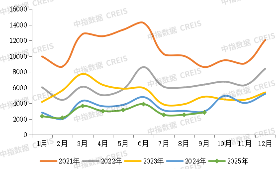 图:2021年1月-2025年9月TOP100房企单月销售额情况(单位:亿元)
