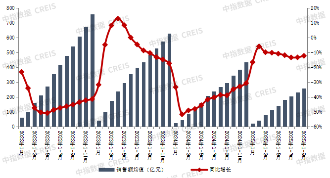 图:2022年1月-2025年1-9月TOP100房企累计销售额均值及增速情况