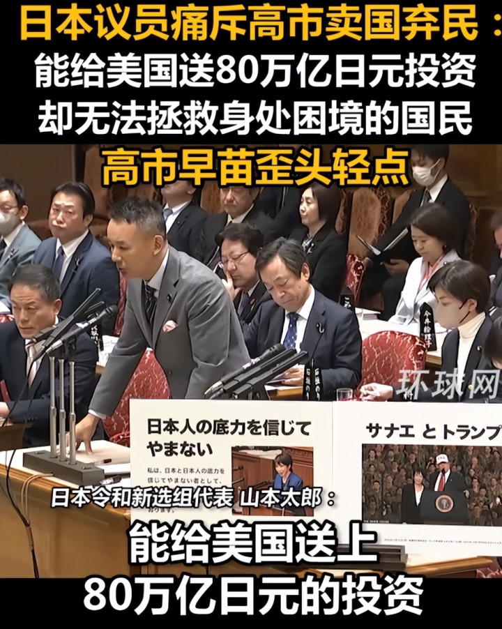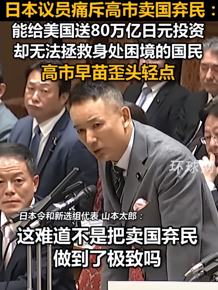 12月15日的日本参议院预算委员会上,山本太郎的痛骂可以说是句句戳心。他直接质问高市早苗:为啥要计划向美国投资约80万亿日元,这折合人民币下来大概4万亿元,把钱都送给美国,却不管日本民众的死活?
