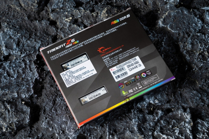 在散热马甲的一侧贴有内存的规格参数标签,我们到手进行评测的芝奇Trident Z5 Neo RGB DDR5内存工作频率是DDR5-6000、工作时序为CL34-44-44-96、不过它的容量非常夸张,单条来到了64GB,双内存可实现128GB超大容量支持。除此之外,系列还有其他工作频率、工作时序以及内存总容量套装可供用户选择。