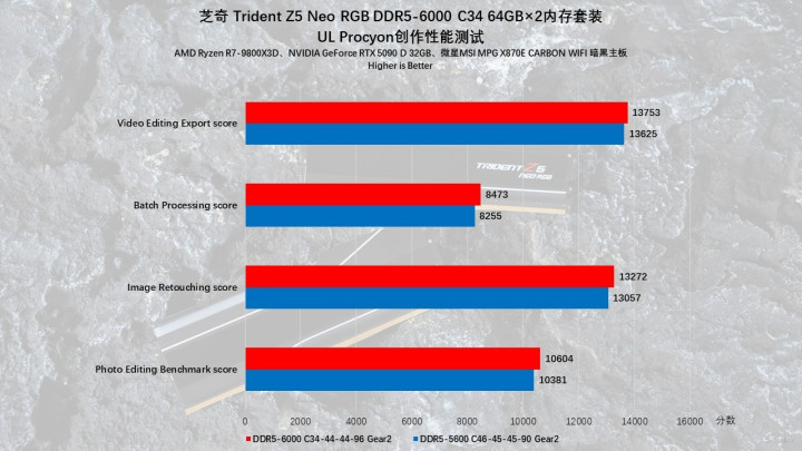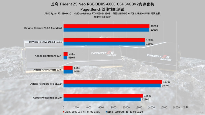 我们又用PugetBench进行了更深度的测试,实测结果与上面基本相符,得益于更高的频率,芝奇Trident Z5 Neo RGB DDR5内存在EXPO-6000MHz下的成绩要优于默频状态,特别是在PS与LR这两个软件中,分别能够领先3%与13%,成绩还是非常可观的。