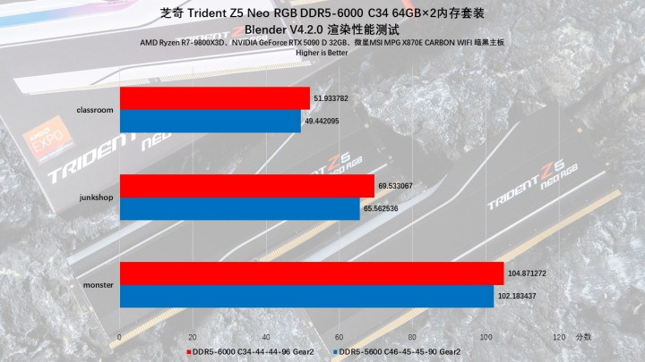 图像编辑与视频剪辑只是创作的一部分,还有不少用户在渲染时对内存的容量与频率也有要求。这里我们用Blender进行了测试,看看高频内存对3D渲染的影响有多大。实测6000MHz的表现要优于JEDEC-5600MHz,部分项目性能差距达到了5%左右,反应在现实情况下,就是高频内存能够带来更快的渲染速度,项目复杂时你的渲染时长更短,能够大大提升工作效率与创作体验。