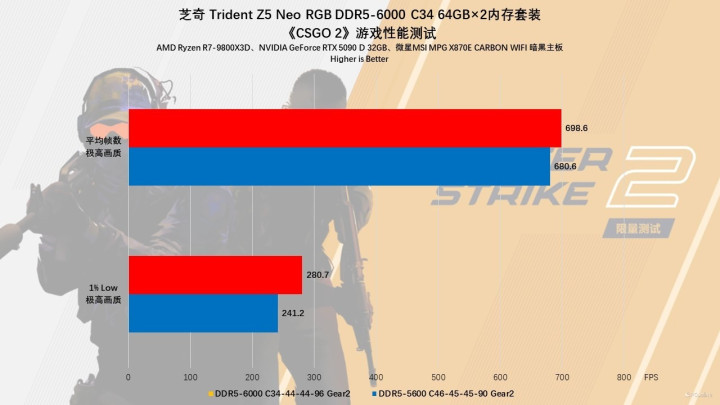 《CSGO》游戏也是如此,平均帧方面二者相差不大,但是一到1%Low帧项目,开启EXPO的芝奇Trident Z5 Neo RGB DDR5内存就是要比默认状态的要稳定一些,并且提升幅度也不小,足足有16%之多!