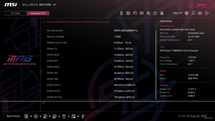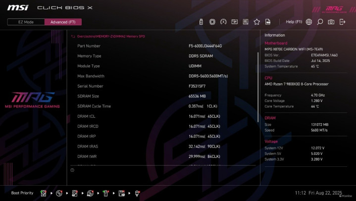 正式测试前,我们可以先在主板BIOS内查看内存的SPD信息,芝奇Trident Z5 Neo RGB DDR5内存支持AMD EXPO技术,内置的SPD信息包含一个默认的JEDEC-5600MHz,以及EXPO-6000MHz C34。