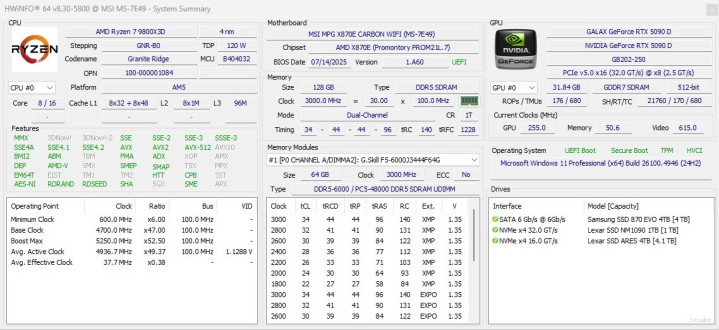 上机以后,打开AIDA64或HWINFO64,还能看到内存更详细的信息,例如我们手上的芝奇Trident Z5 Neo RGB DDR5内存搭载的是三星原厂高性能颗粒M-Die。生产时间是2025年第28周,也算是新鲜出炉的产品了。