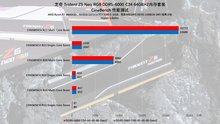 首先我们测试了CineBench系列软件,发现内存频率对处理器的性能释放也有不小的影响。当芝奇Trident Z5 Neo RGB DDR5内存开启EXPO-6000MHz时,其多核性能对比默频状态都有一定程度的提升,如CineBench R15中由942分提升至947分,CineBench R20里则从8860分提升至8892分,CineBench R23里为22689分提升至22773分。