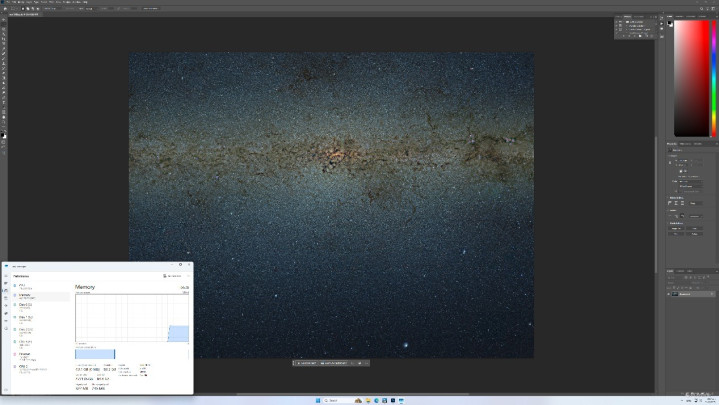 这里我们也找了一张24GB的PSB图片进行测试,我们分别使用48GB内存以及128GB内存在Photoshop中打开这张照片,实测显示48GB内存时打开图片需要60秒以上,而128GB内存下打开这张图片仅需42秒。