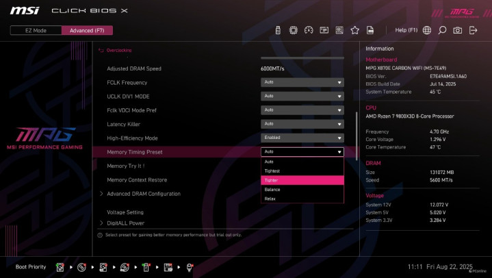 当然追求更强性能的话,微星主板也给各位极客准备了一些内存独属的黑科技,例如我们可以在MPG X870E CARBON WIFI暗黑主板上开启Memory Timing Preset功能,它可以进一步优化内存小参,让内存性能更上一个台阶。