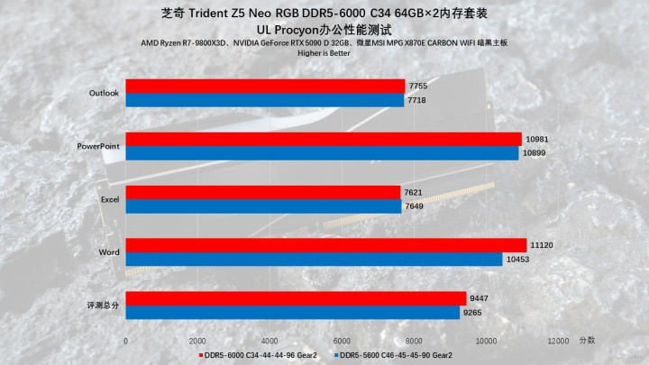 接下来轮到创作性能部分,先来点简单的,基础办公软件测试,不得不说内存频率一样影响基础性能的发挥。实测EXPO-6000MHz下,芝奇Trident Z5 Neo RGB DDR5内存在UL Procyon的办公基准测试里得分9447分,而默认频率下的分数为9265分。
