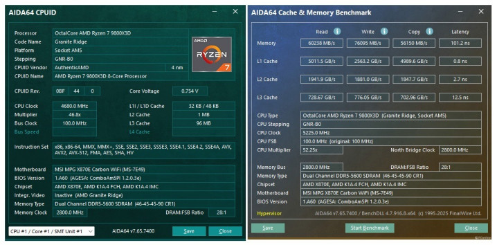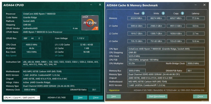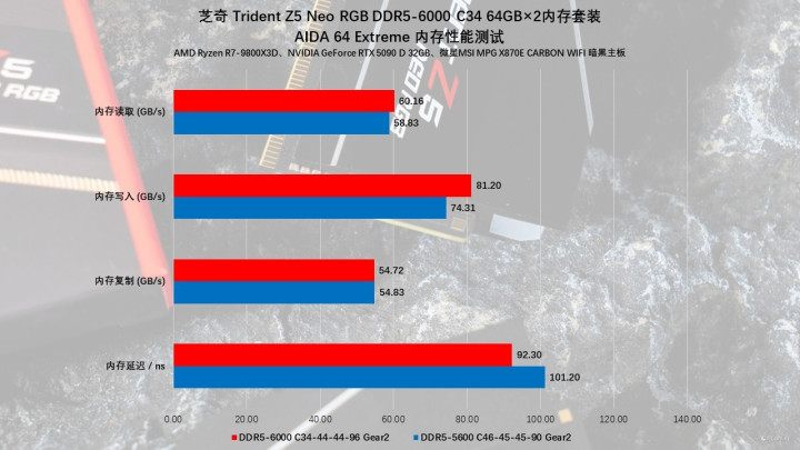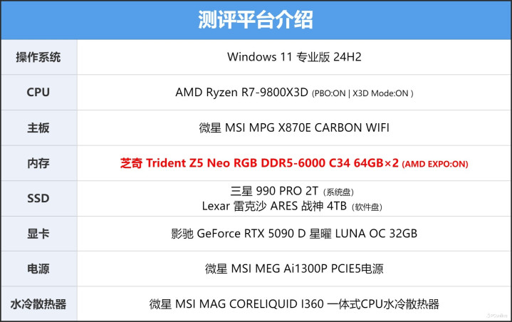 正式开始测试前,照例先介绍一下我们的测试平台。既然是专为AMD平台优化的内存,那我们自然得请出最近大名鼎鼎的AMD Ryzen R7-9800X3D处理器。则是地表最强的NVIDIA GeForce RTX 5090 D 32GB,性能表现绝对的顶级。主板则是来自微星的MPG X870E CARBON WIFI 暗黑主板,它搭载了不少独门内存黑科技,针对内存性能进行了特殊优化,能够最大限度激发内存潜力,与我们这次上手的芝奇Trident Z5 Neo RGB DDR5内存可以说是非常契合了。