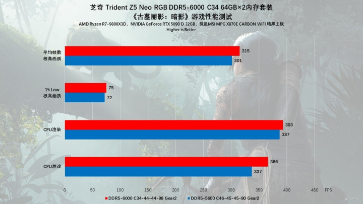 下面进行第二款游戏的测试,《古墓丽影:暗影》,这也是一款老牌的3A大作了。实测5600MHz下,游戏的平均帧为301 FPS,1%Low帧为72 FPS,CPU渲染为387 FPS,CPU游戏为337 FPS。提升频率至6000MHz后,平均帧已经提升了15 FPS左右,而CPU渲染、CPU游戏也有一定程度的提升,其中CPU游戏提升最明显,相比5600MHz提升约9%。