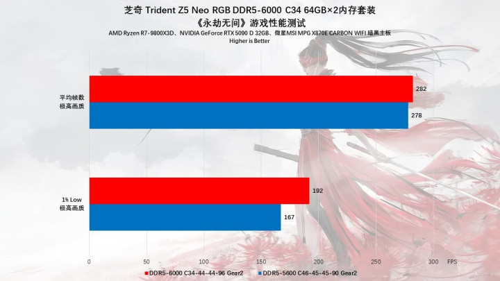 内存频率的高低在《永劫无间》里会比较明显一些,特别是1%Low帧,例如5600MHz下游戏平均帧为278 FPS,1%Low为167 FPS,而开启EXPO档位后,游戏平均帧相差不多,但是1%Low提升了将近30 FPS,反映在游戏中就是你的体验更加丝滑,卡顿或者跳帧的情况更少,能够大大提升游戏体验,特别是这种追求FPS的游戏,更高的1% Low往往就是决胜的关键。